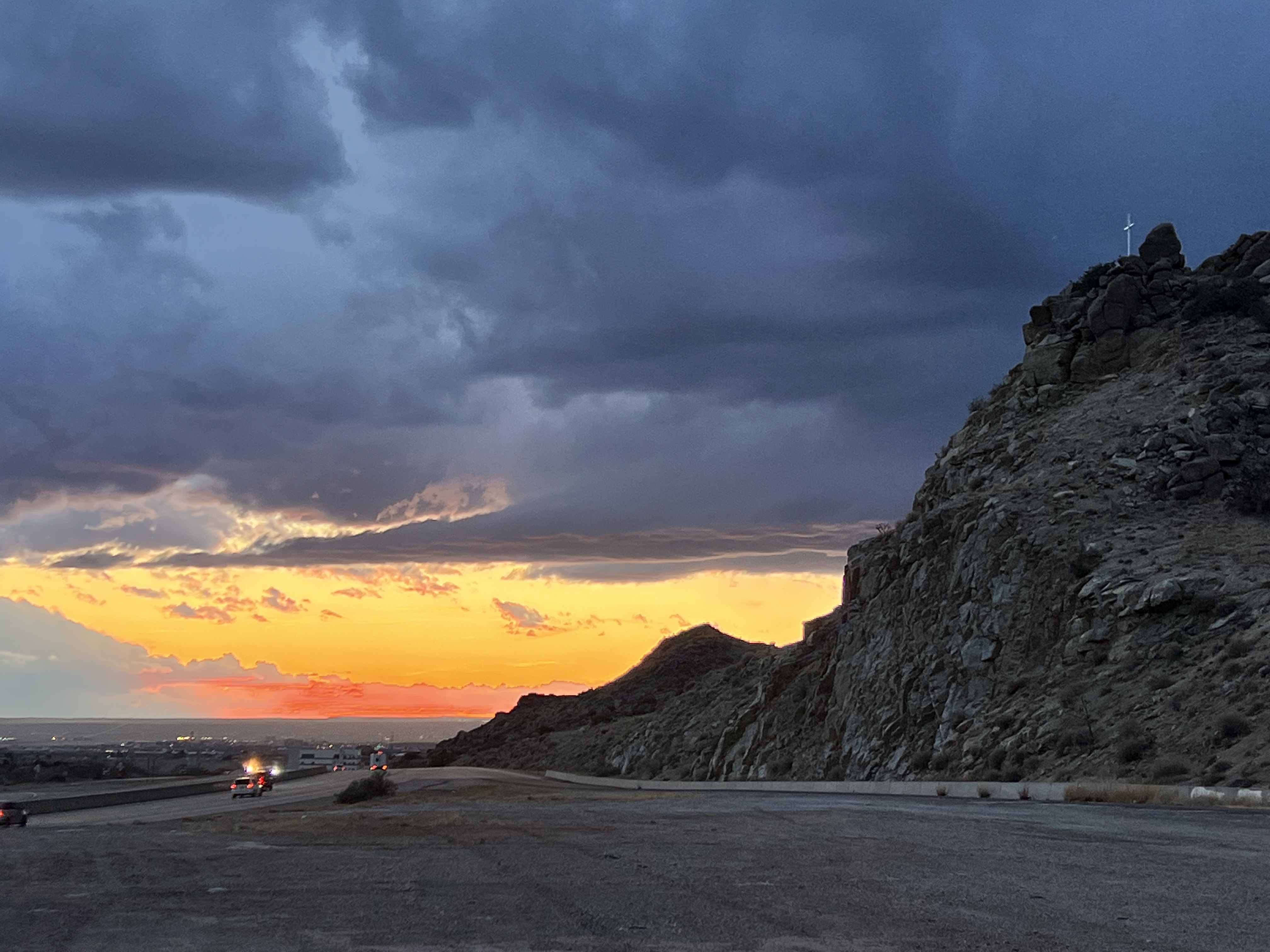 Erected in 1932 by Father Libertine, the cross in Tijeras Canyon (seen upper right) was intended to encourage travelers to stop and meditate. Prior to construction of Interstate 40 a religious procession to the cross from one of two churches in Carnuel was held during a fiesta every year on May 3rd.
